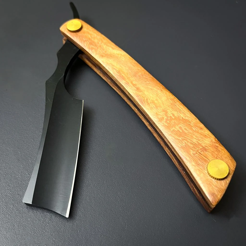 These straight razors are crafted of incredibly sharp J2 steel for the ultimate close and smooth shave. The sleek blade has been powder-coated matt-black with a high contrast polished blade edge, which folds seamlessly into a finely finished warm wood grip with brass fittings. The razor comes housed in a black leather sheath, embossed with the Raven Forge logo.