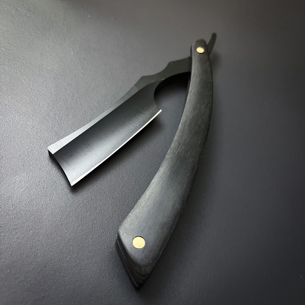 These straight razors are crafted of incredibly sharp J2 steel for the ultimate close and smooth shave. The sleek blade has been power-coated matt-black with a contrasting polished blade edge, which folds seamlessly into a finely finished matching black wood grip with brass fittings. The razor comes housed in a black leather sheath, embossed with the Raven Forge logo.